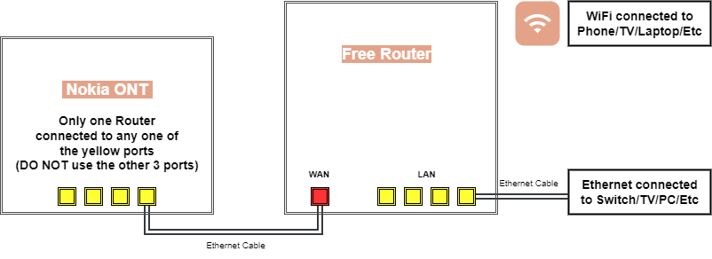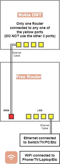 Connect your Free Router following the diagram above once you have 3 green lights on the Nokia (black box) PWR, PON and AUTH.