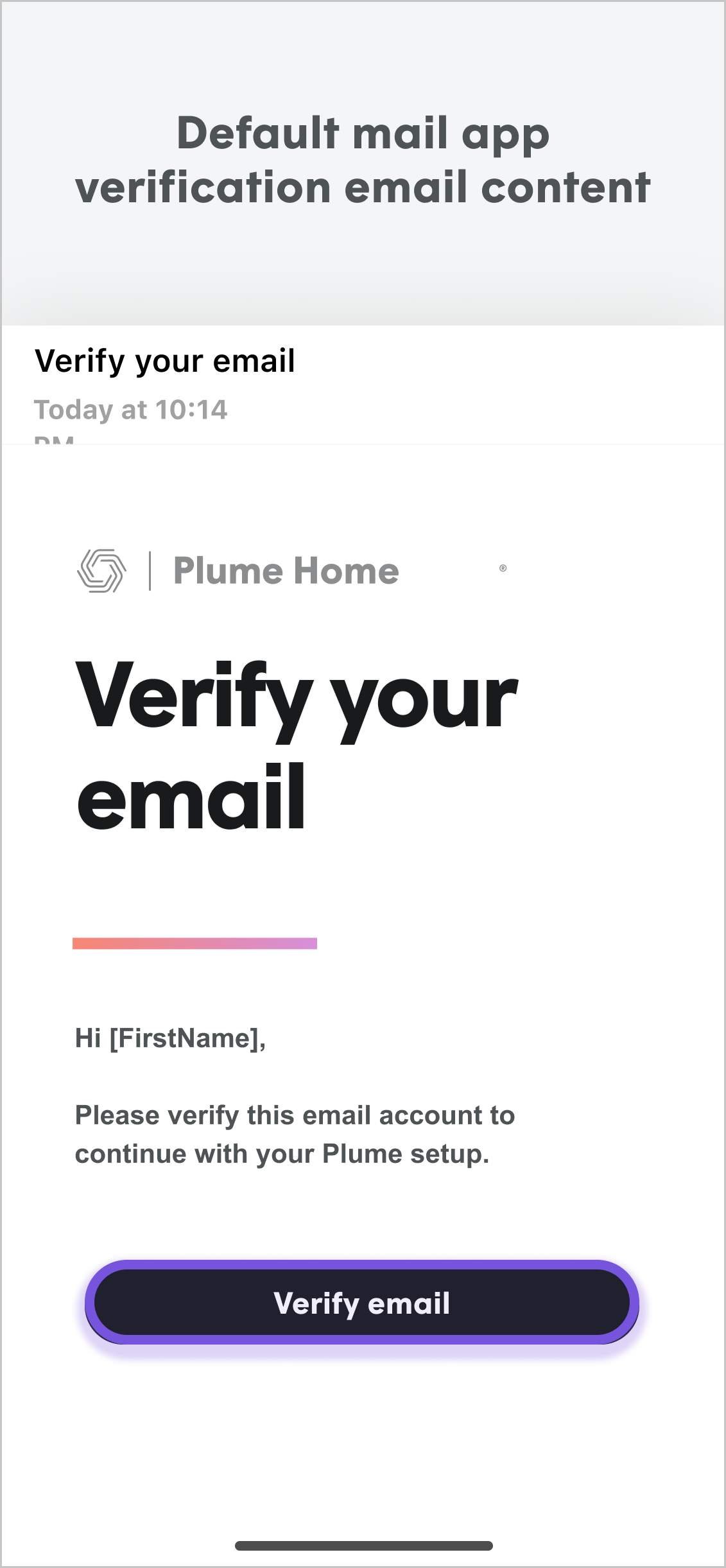 Before proceeding you must verify your email address. Open your email app and find the verification email. Tap on the link in the email. This will open a browser confirmation with a link that will re-open the Plume Home App on the device