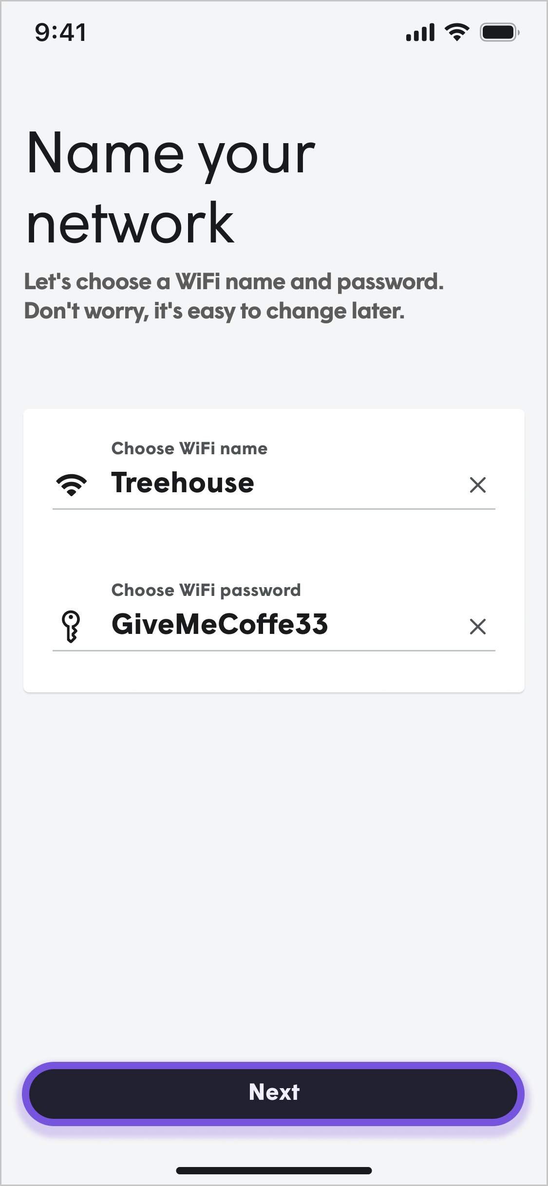 The WiFi name (SSID) and password must be entered before the Next button will be available. Passwords must be between 8 and 63 characters in length.